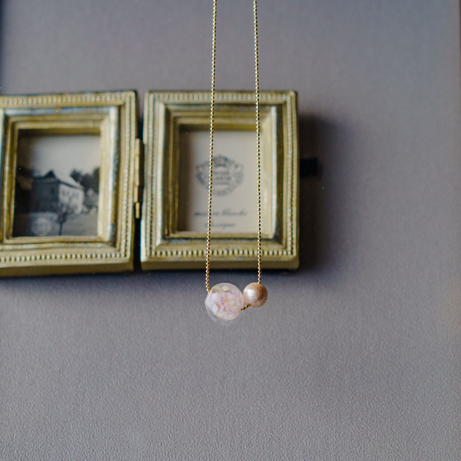 素材:ガラス、真鍮チェーン、コットンパール